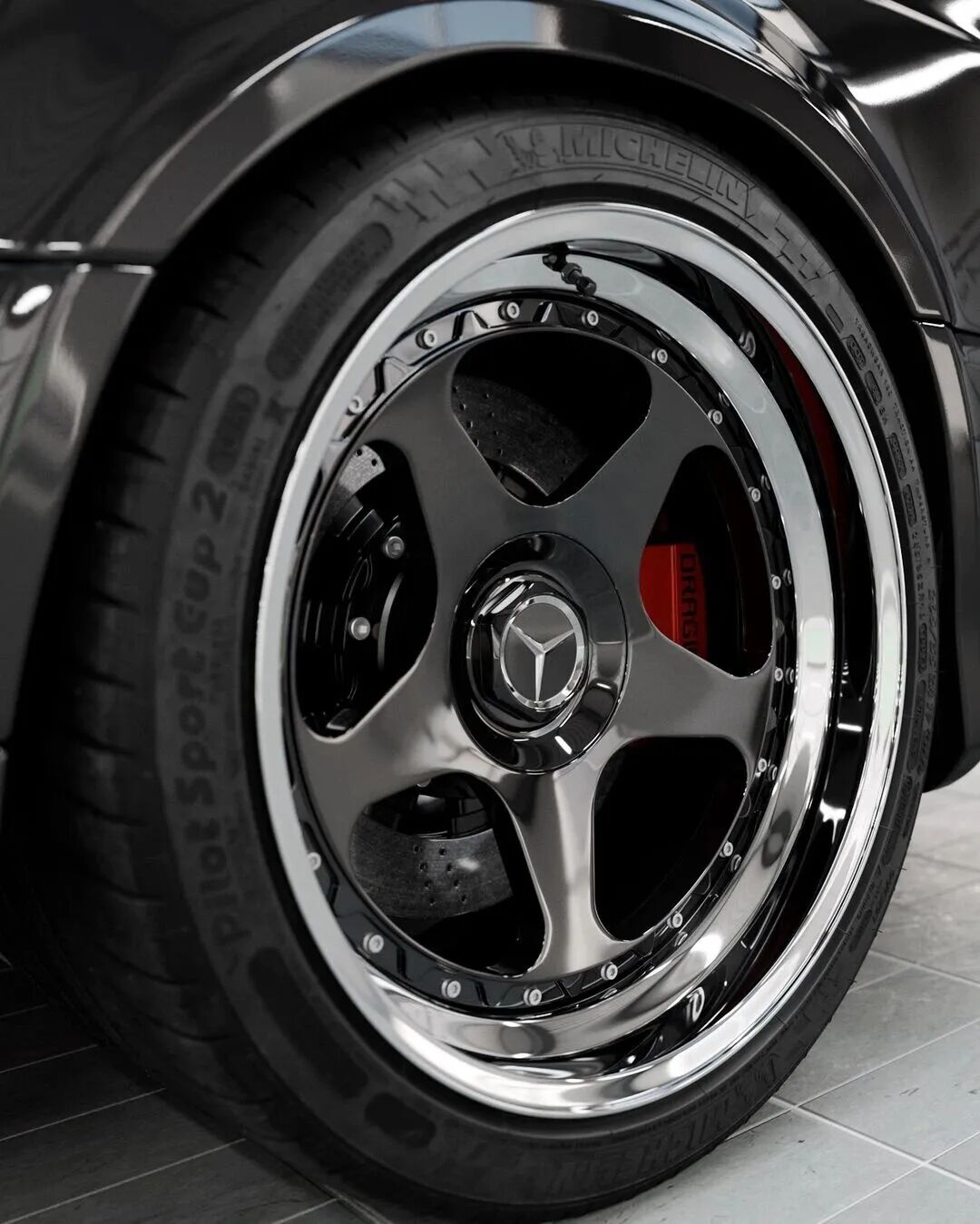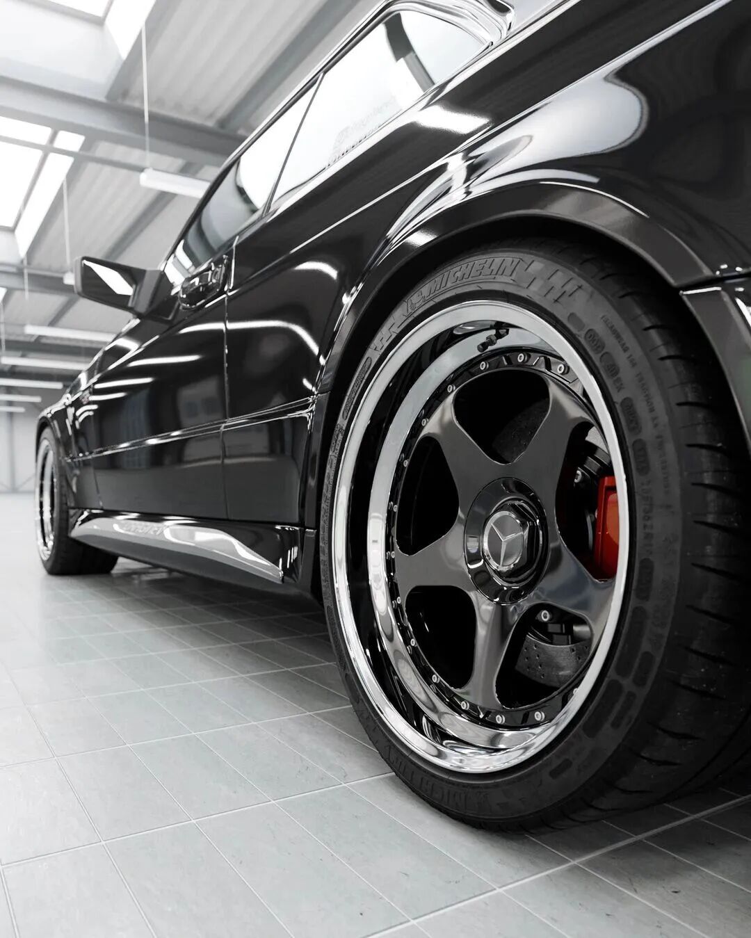 Draginev并没有破坏W126 SEC coupe与生俱来的气质,而是通过极具张力的宽体套件,让原本优雅的线条爆发出蓄势待发的力量感。Rotiform 19英寸锻造轮毂与米其林高性能轮胎的组合,不仅是视觉上的点睛之笔,更是征服赛道的技术保障。