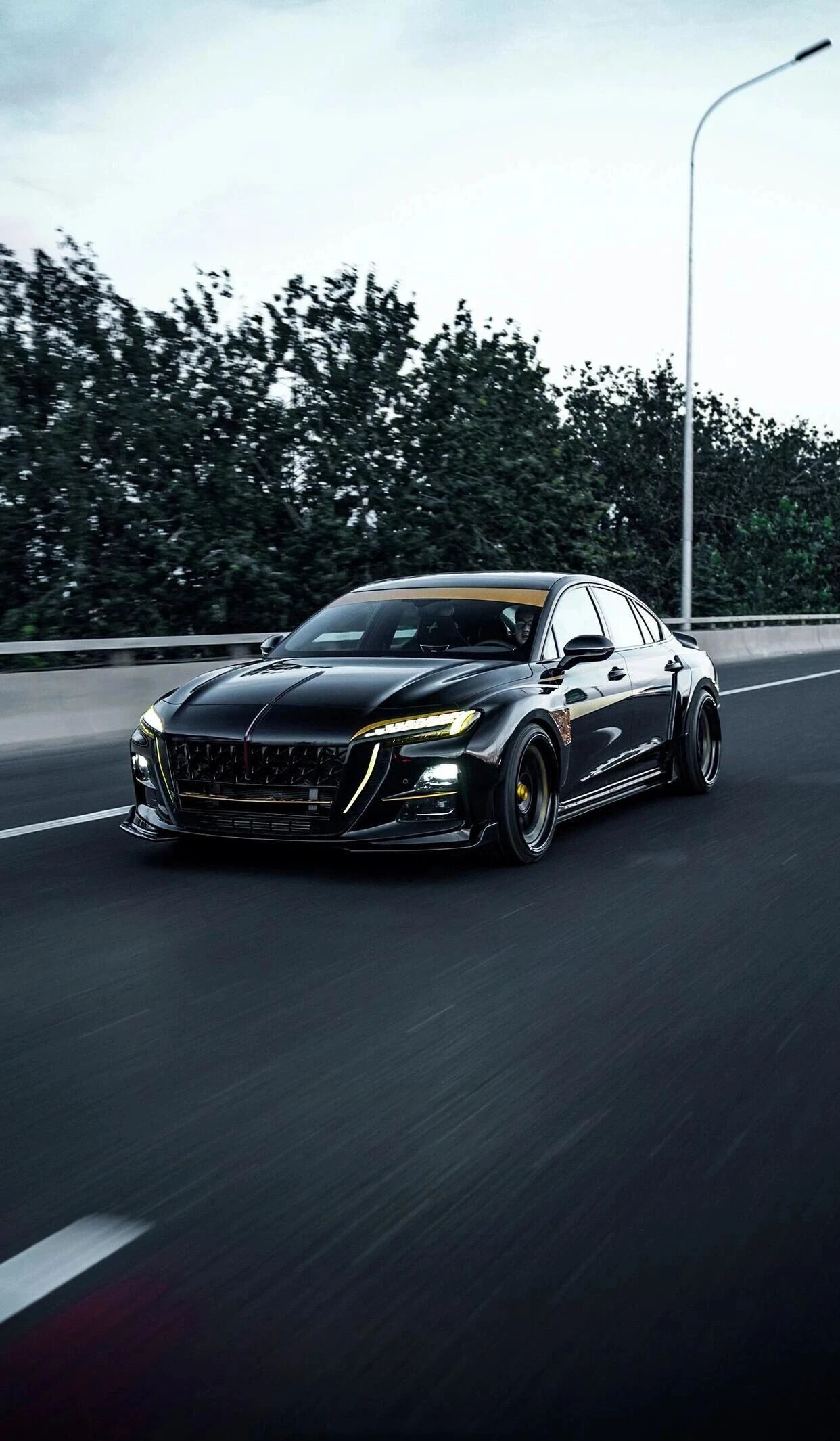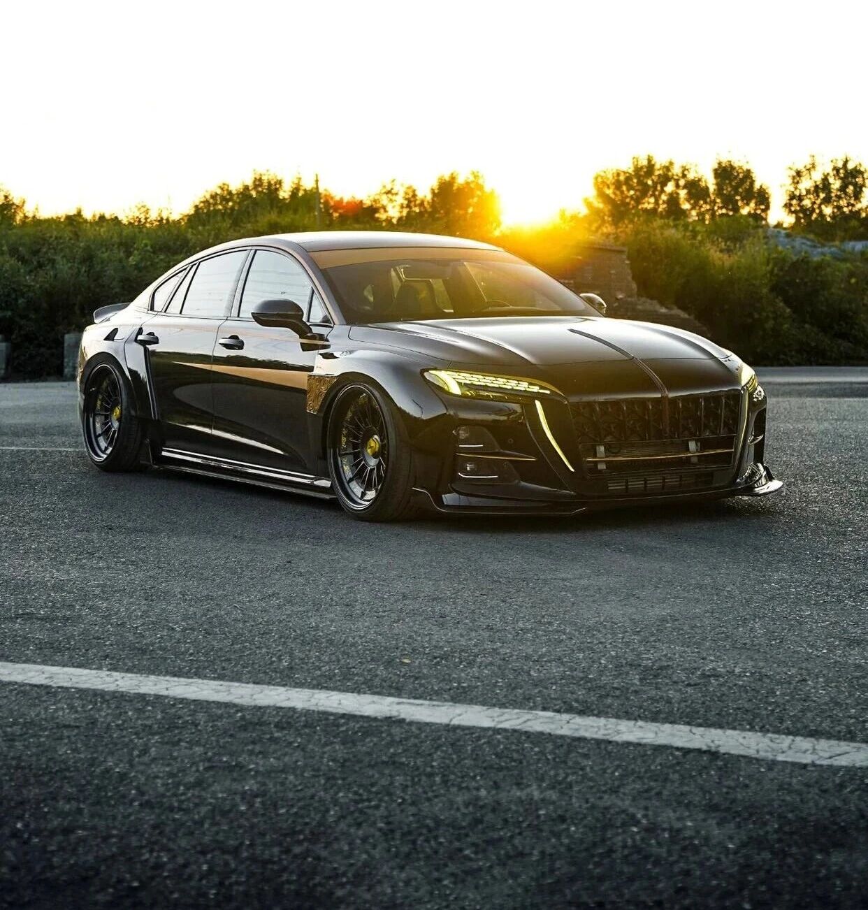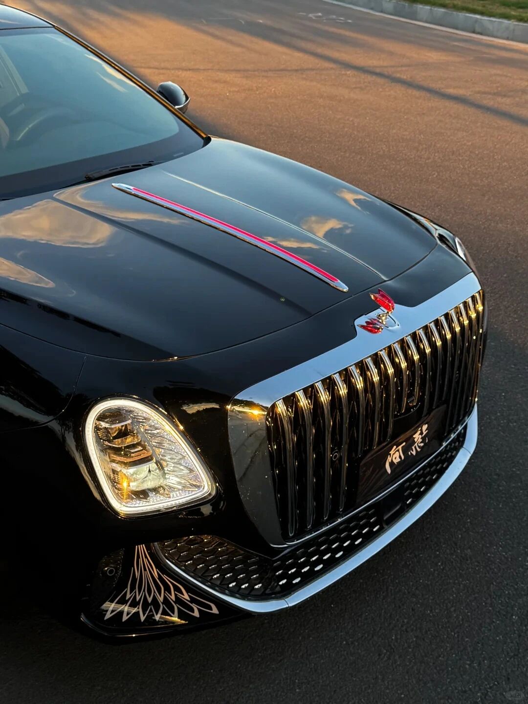 车身采用玄武黑哑光涂装,搭配金色流星线条贯穿侧围。前脸保留直瀑式格栅的威严,升级为脉冲式发光结构。