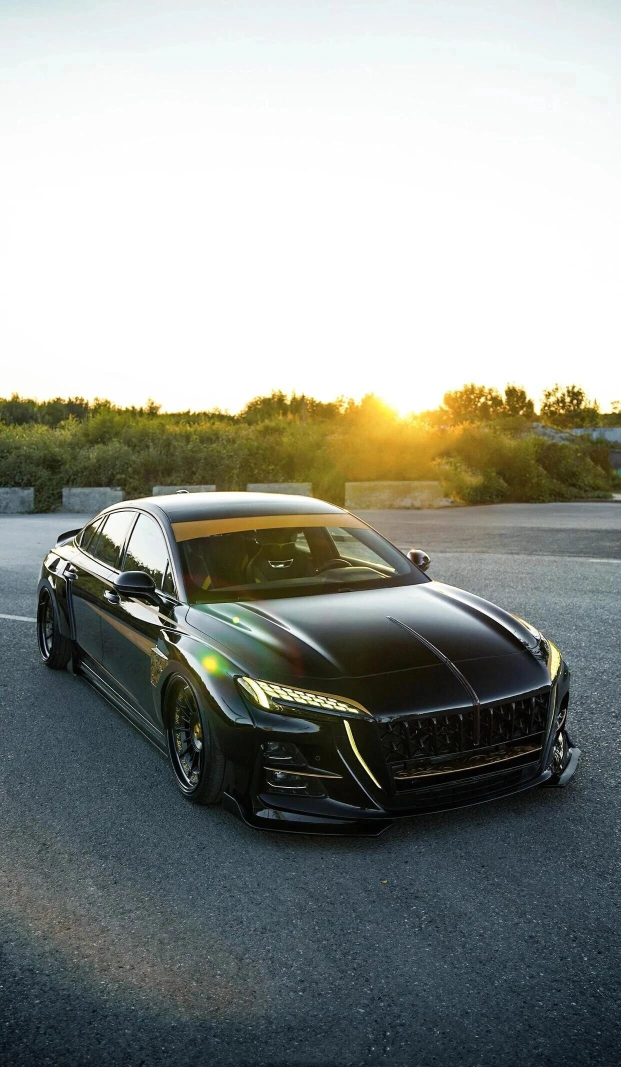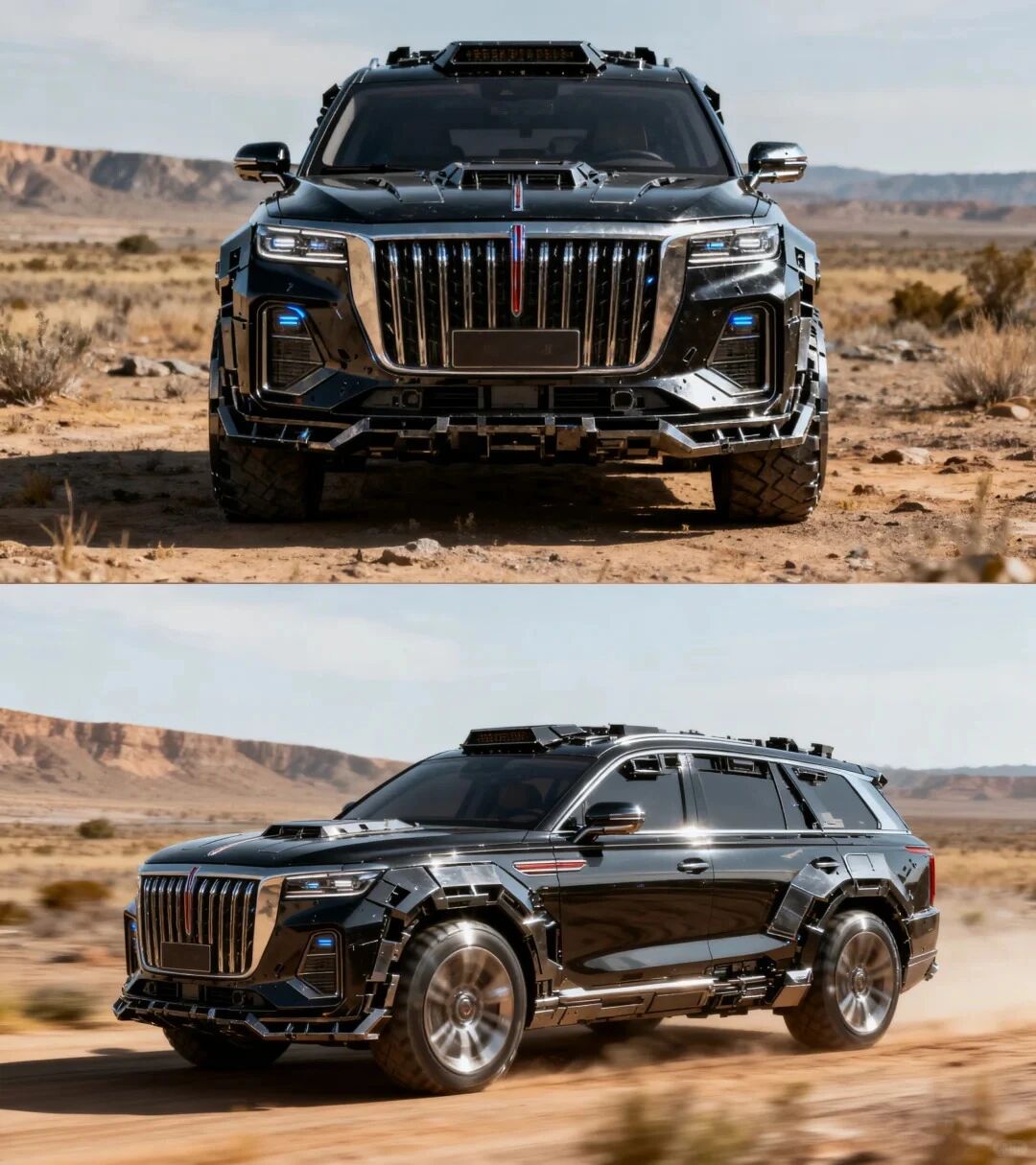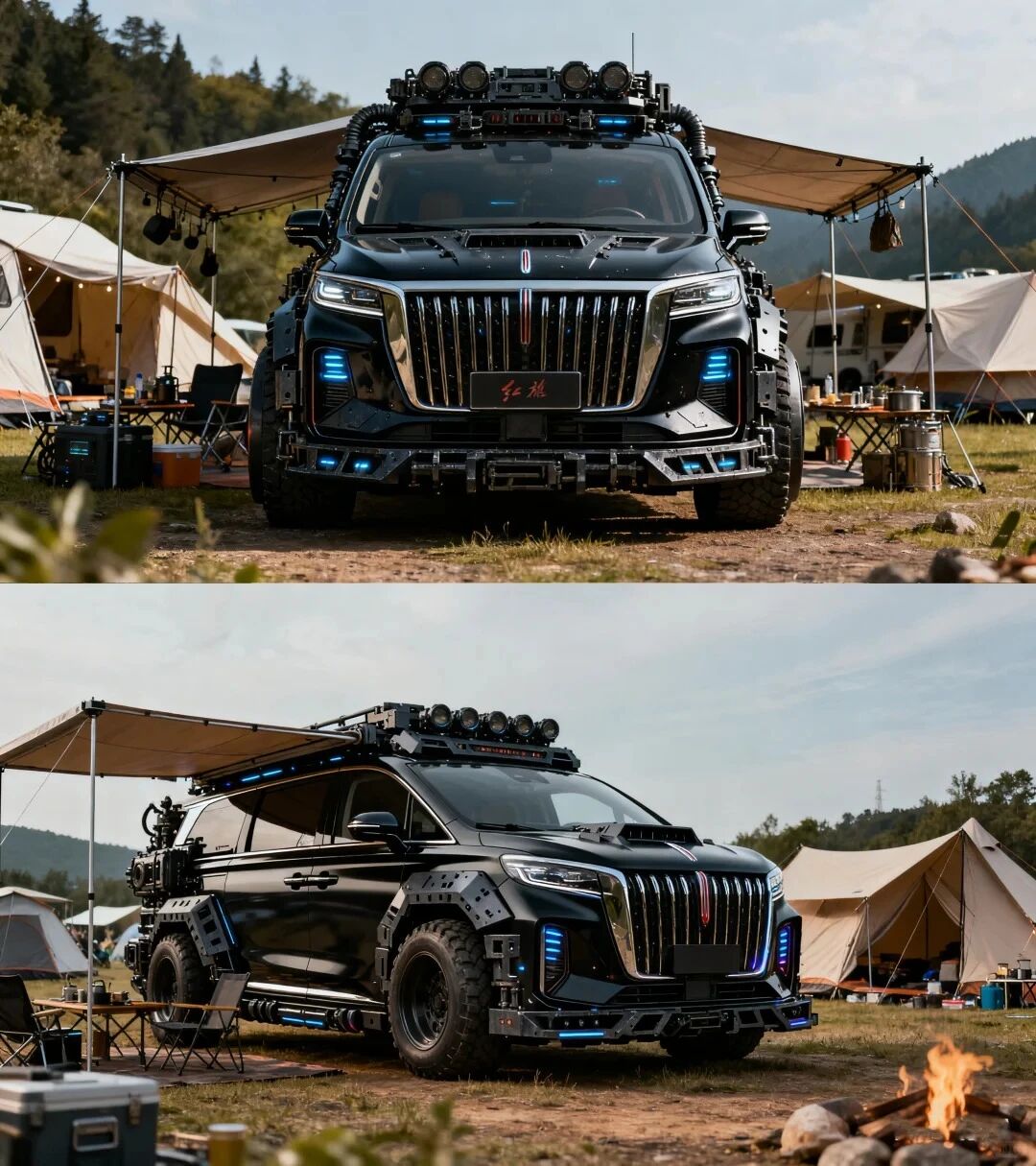 车身采用玄武黑哑光涂装,搭配金色流星线条贯穿侧围。前脸保留直瀑式格栅的威严,升级为脉冲式发光结构。