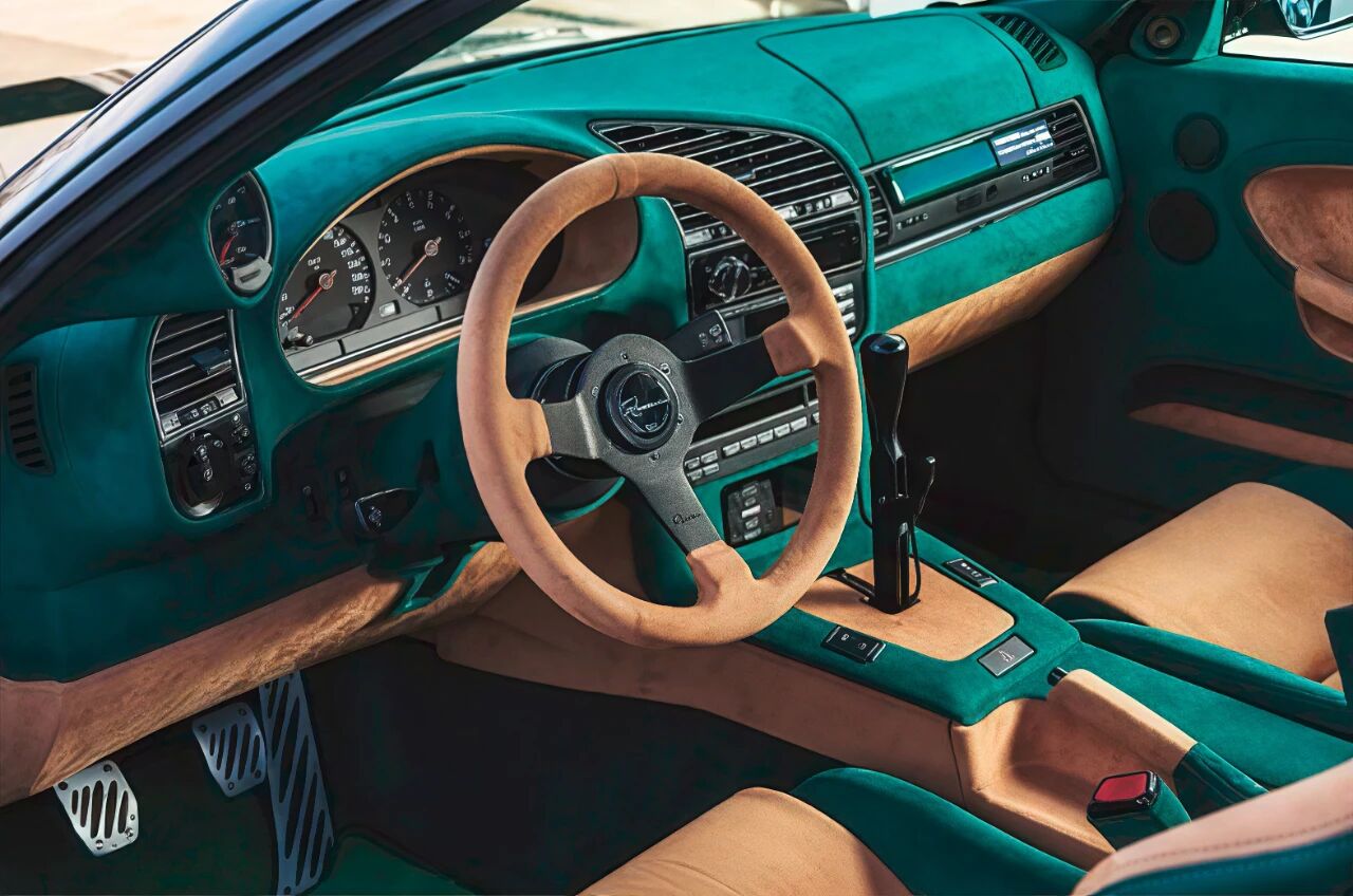 内饰方面更是把“复古疯”玩到了极致:90年代经典风格的深绿色仪表台、方向盘,搭配包裹性超强的RECARO桶椅,座椅的黄褐色皮质带着淡淡的复古光泽,坐进去瞬间就能感受到当年的老车韵味。